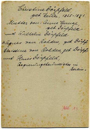 Keywords: 1825-1871 Christine Dörpfeld, geb. Keller, Kabinettfotografie von Emil Flasche, Barmen, Revers.jpg Revers der Kabinettfotografie mit den handschriftlichen Erläuterungen Zitat Christine Dörpfeld geb Keller 1825-1871 Mutter von Anna Carnap geb Dörpfeld und Wilhelm Dörpfeld u Agnes von Rohden geb Dörpf Christine von Rohden geb Dörpf und Hans Dörpfeld Regierungsbaumeister in Berlin 'Sammlung Klaus Goebel http //bbf dipf de/cgi-opac/bil pl x u t_short x ix art sv emil+flasche+barmen reccheck 53337 ~ 1865 Emil Flasche <gallery> File 1825-1871 Christine Dörpfeld geb Keller Kabinettfotografie von Emil Flasche Barmen Bildseite jpg Bildseite </gallery> PD-old Emil Flasche Fotograf 19th-century people of Wuppertal Friedrich Wilhelm Dörpfeld Wilhelm Dörpfeld Hans Dörpfeld Klaus Goebel Pictura Paedagogica Online Bibliothek für Bildungsgeschichtliche Forschung |