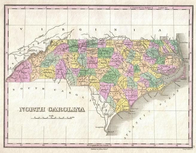 | Keywords: 1827 Finley Map of North Carolina - Geographicus - NorthCarolina-finley-1827.jpg A beautiful example of Finley's important 1827 map of North Carolina This rare map plate configuration depicts the state individually rather than bundled with South Carolina - as is more common Depicts the state with moderate detail in Finley's classic minimalist style Offers color coding at the county level Identifies Cape Lookout Cape Hatteras and Cape Fear Title and scale in lower left quadrant Engraved by Young and Delleker for the 1827 edition of Anthony Finley's General Atlas 1827 undated Size in 11 5 9 object history credit line accession number NorthCarolina-finley-1827 Finley Anthony <i>A New General Altas Comprising a Complete Set of Maps representing the Grand Divisions of the Globe Together with the several Empires Kingdoms and States in the World; Compiled from the Best Authorities and corrected by the Most Recent Discoveries</i> Philadelphia 1827 Geographicus-source PD-old-100 Anthony Finley Maps by Anthony Finley 1827 maps Old maps of North Carolina |