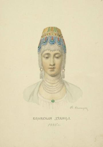 | Keywords: Солнцев Боровская девица 1835 b.jpg ru Бо овская девица Ф Г Солнцев «Одежды Русского госуда ства» 1835 https //vk com/album-43310606_170289551 Creator Fedor Solntsev other versions Custom license marker 2015 02 08 PD-old-100 Clothes Of Russian Country - Folk clothing Russian costumes of Kaluga Governorate Uploaded with UploadWizard Venets headgear |