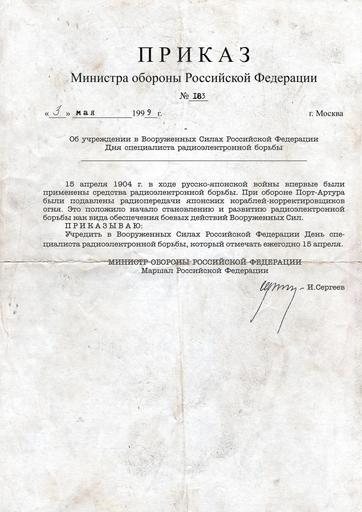 Keywords: Приказ МО РФ №183.jpg ru П иказ инист а обо оны Российской Феде ации 183 от 3 мая 1999 года own Kostik1987 PD-RU-exempt Electronic warfare Military documents