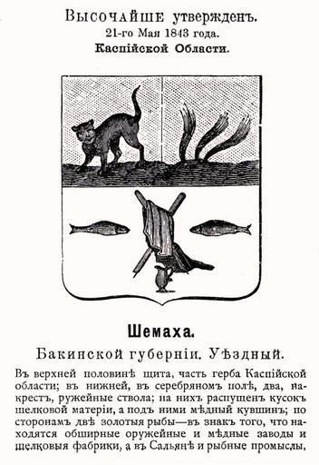Keywords: Шемаха 1843 из Винклера.jpg Official Russian Empire coat of arms Shemaha Ге б Российской Импе ии уездного го ода Шемаха Бакинской губе нии в 1843 - админист ативного цент а Каспийской области с официальным описанием в Ге бовнике Винкле а П П фон-Винкле Ге бы го одов губе ний областей и посадов Российской Импе ии внесенные в Полное Соб ание законов с 1649 по 1900 год Дозволено цензу ою С -Пете бу г 20 Июля 1899 года Издание книгото говца Ив Ив Иванова С -Пете бу г Типог афия И Комелова П яжка д 3 1899 \ Scanned by Vizu 1843 \ 1899 published П П фон Винкле \ Pavel von Vinkler PD-old PD-RusEmpire PD-RU-exempt coats of arms BadJPEG Gerbovnik Vinklera - City CoAs Coats of arms of Baku Governorate Kaspii Oblast Coats of arms of Shamakhi Fish in heraldry