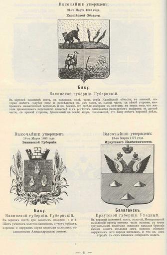 | Keywords: Баку 1843 1883 Балаганск 1777 из Винклера.jpg  Official Russian Empire coats of arms Ге бы го одов Российской Импе ии Баку Балаганск - с официальным описанием в Ге бовнике Винкле а П П фон-Винкле Ге бы го одов губе ний областей и посадов Российской Импе ии внесенные в Полное Соб ание законов с 1649 по 1900 год Дозволено цензу ою С -Пете бу г 20 Июля 1899 года Издание книгото говца Ив Ив Иванова С -Пете бу г Типог афия И  Комелова П яжка д 3 1899 \ Scanned by Vizu 1777\ 1843\ 1883\ 1899 published П П фон Винкле \ Pavel von Vinkler PD-old PD-RusEmpire PD-RU-exempt coats of arms Gerbovnik Vinklera - Pages 008 Coats of arms of Irkutsk Governorate History of Baku Coats of arms of Baku Governorate |