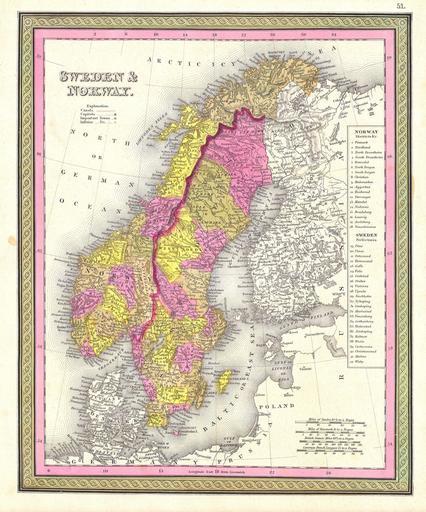 | Keywords: 1850 Mitchell Map of Sweden and Norway - Geographicus - SwedenNorway-m-50.jpg This scarce hand colored map is a lithographic engraving of Norway and Sweden dating to 1846 by the legendary American Mapmaker S A Mitchell the elder Depicts Scandinavia in full from the Arctic to Denmark Includes Finland Chart of governing districts on the left side 1850 Size in 12 5 10 object history credit line accession number SwedenNorway-m-50 Geographicus-source PD-old-100 Maps by Samuel Augustus Mitchell Old maps of Scandinavia 1850 in Sweden 1850 maps Maps in English |