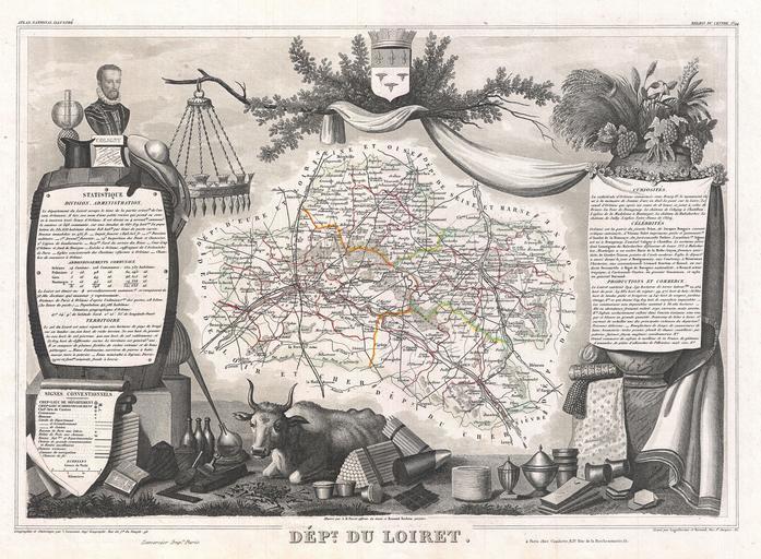 | Keywords: 1852 Levasseur Map of the Department Du Loiret, France - Geographicus - Loiret-levasseur-1852.jpg  This is a fascinating 1852 map of the French department of Loiret France Surrounding the city of Orleans Loiret is considered the heart of France and is a registered Unesco World Heritage Site This area of France is also part of the Loire Valley wine region and is especially known for its production of Pinot Noirs and Gris Meuniers in the Orleans area The map proper is surrounded by elaborate decorative engravings designed to illustrate both the natural beauty and trade richness of the land There is a short textual history of the regions depicted on both the left and right sides of the map Published by V Levasseur in the 1852 edition of his Atlas National de la France Illustree 1852 undated Size in 16 5 11 5 object history credit line accession number Loiret-levasseur-1852 Levassuer V <i>Atlas National Illustre des 86 Departements et des Possessions de La France Divise par Arrondissements Cantons et Communea avec La Trace de Toutes Les Routes Chemins de fer et Canaux </i> 1852 edition Geographicus-source PD-old-100 Victor Levasseur - Maps of France France 1852 maps France Old maps of Loiret |