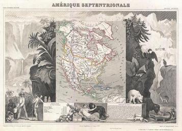 Keywords: 1852 Levasseur Map of North America (w- Republic of Texas) - Geographicus - AmeriqueSeptentrionale-levassuer-1852.jpg A visually stunning decorative map of North America dating to 1852 by French map publisher Victor Levasseur Levasseur published several different editions of his North America map - this being the most desirable due to its depictions of the ephemeral Republic of Texas Though cartographically minimalist there are a number of additional important elements that are worthy of note These include the extension of Oregon territory well into British Columbia reflecting the American claims that later led to the 54 40' dispute Also the Northwest Passage from Atlantic to Pacific is drawn as an open and practically navigable seaway By far this map's most striking feature is its elaborate allegorical border work Levasseur composed this map for publication in his magnificent Atlas Nacionale de la France Illustree one of the most decorative and beautifully produced atlases to appear in the 19th century This particular map is surrounded by wide and elaborate illustrative border work showing the cultural natural and trade richness of the Americas The left hand side of the map depicts European seamen bargaining for indigenous products In the background is a Mesoamerican style pyramid dramatic mountain scenery and a railroad train The right hand side of the map shows a cross-section of the flora and fauna common to the continent including a Bison vultures a polar bear an elk a fox and an alligator In the undergrowth a leopard lies hidden At the base of the map a classically dressed woman lounges with a St Bernard and Bale of Cotton To either side her text boxes offer additional information about the discovery history and culture of the region A population table appearing at the bottom of the map gives statistics for the Arctic 50 000 Alaska or Russian America 50 000 British America 1 200 000 the United States 19 000 000 Texas 200 000 Mexico 8 000 000 Guatemala 3 000 000 and the Antilles 2 720 000 Publised by V Levasseur in the 1852 edition of his Atlas National de la France Illustree 1852 undated Size in 16 5 12 5 object history credit line accession number AmeriqueSeptentrionale-levassuer-1852 Levassuer V <i>Atlas National Illustre des 86 Departements et des Possessions de La France Divise par Arrondissements Cantons et Communea avec La Trace de Toutes Les Routes Chemins de fer et Canaux </i> 1852 edition Geographicus-source PD-old-100 Victor Levasseur - Maps of the world Old maps of North America 1852 maps Merchants in art Engravings of animals Maps in French Caduceus