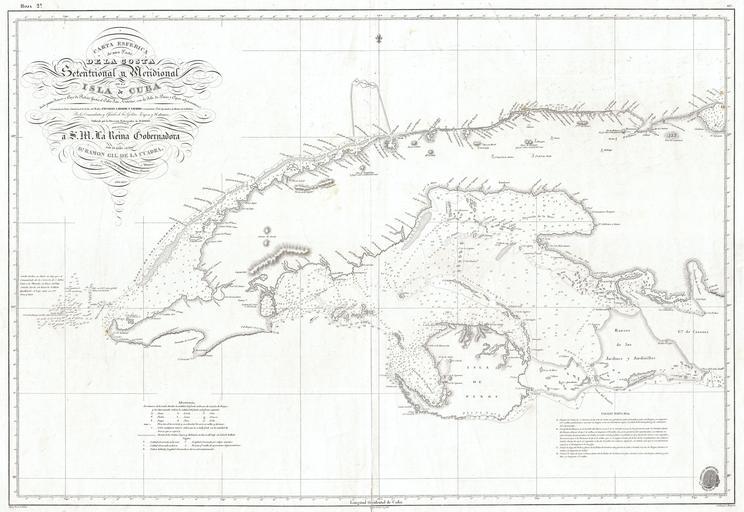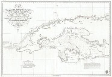 | Keywords: 1854 Hidrografica Nautical Chart of Map of Cuba - Geographicus - CubaWest-hydrografica-1837.jpg This is a dramatic and exceptionally rare 1854 nautical chart or map of the western part of Cuba by the Spanish mapping agency Direccion Hidrografica Covers the West India island from Cape San Antonio eastward as far as the Gulf of Cazones Includes the Isla de Pinos and the city of Havana Chart offers countless depth soundings as well as notes on the construction of the chart and navigation Offers some inland detail identifying a number of important mountains as well as the villages of Guanajayu San Antonio de los Banos San Antonio de Bedia Manajau Madruga and countless others While generally a black and white chart lighthouses are noted with splashes of yellow and red color A directional title cartouche appears in the upper left quadrant The logo of the Direcction Hidrografica appears in the lower right quadrant This map was prepared by a party under the command of the Spanish marine Angel Laborde y Navarro It was ordered by Don Ramon Gil de la Cuadra head of the Direccion Hidrografica Published in 1837 and updated to 1854 1854 dated Size in 35 24 object history credit line accession number CubaWest-hydrografica-1837 Geographicus-source PD-art Old maps of Cuba 1854 maps |