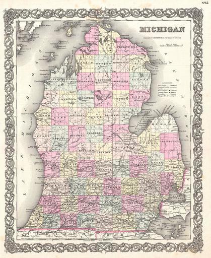 | Keywords: 1855 Colton Map of Michigan - Geographicus - Michigan-colton-1855.jpg  A beautiful 1855 first edition example of Colton's map of Michigan Covers lower part of the state bounded by Lake Michigan on the west and Lake Huron on the east Like most of Colton's state maps this map is largely derived from an earlier wall map of North America produced by Colton and D Griffing Johnson Colton identifies various cities towns forts rivers rapids fords and an assortment of additional topographical details Map is hand colored in pink green yellow and blue pastels to define county and state boundaries Surrounded by Colton's typical spiral motif border Dated and copyrighted to J H Colton 1855 Published from Colton's 172 William Street Office in New York City Issued as page no 42 in volume 1 of the first edition of George Washington Colton's 1855 Atlas of the World 1855 dated Size in 13 16 object history credit line accession number Michigan-colton-1855 Colton G W <i>Colton's Atlas of the World Illustrating Physical and Political Geography</i> Vol 1 New York 1855 First Edition Geographicus-source PD-old-100 Maps by Joseph Hutchins Colton Old maps of Michigan 1855 maps |