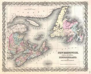 Keywords: 1855 Colton Map of New Brunswick, Nova Scotia, Newfoundland and Price Edward Island - Geographicus - NovaScotia-colton-1855.jpg An excellent first edition example of Colton's rare 1855 map of the Maritime Provinces of New Brunswick Nova Scotia Newfoundland and Prince Edward Island Throughout the map Colton identifies various cities towns forts rivers rapids fords and an assortment of additional topographical details Map is hand colored in pink green yellow and blue pastels to define national and regional boundaries Surrounded by Colton's typical spiral motif border Dated and copyrighted to J H Colton 1855 Published as page no 4 in volume 1 of the first edition of George Washington Colton's 1855 Atlas of the World 1855 dated Size in 16 13 object history credit line accession number NovaScotia-colton-1855 Colton G W <i>Colton's Atlas of the World Illustrating Physical and Political Geography</i> Vol 1 New York 1855 First Edition Geographicus-source PD-old-100 Maps by Joseph Hutchins Colton Old maps of the Gulf of Saint Lawrence Old maps of New Brunswick Old maps of Nova Scotia Old maps of Newfoundland Old maps of Prince Edward Island 1855 maps of Canada |