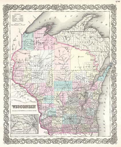 | Keywords: 1855 Colton Map of Wisconsin - Geographicus - Wisconsin-colton-1855.jpg  A beautiful 1855 first edition example of Colton's map of Wisconsin Covers the entire state as well as adjacent parts of Minnesota and upper Michigan Like most of Colton's state maps this map is largely derived from an earlier wall map of North America produced by Colton and D Griffing Johnson Colton identifies various cities towns forts rivers rapids fords and an assortment of additional topographical details Map is hand colored in pink green yellow and blue pastels to define county and state boundaries Surrounded by Colton's typical spiral motif border Dated and copyrighted to J H Colton 1855 Published from Colton's 172 William Street Office in New York City Issued as page no 48 in volume 1 of the first edition of George Washington Colton's 1855 Atlas of the World 1855 dated Size in 13 16 object history credit line accession number Wisconsin-colton-1855 Colton G W <i>Colton's Atlas of the World Illustrating Physical and Political Geography</i> Vol 1 New York 1855 First Edition Geographicus-source PD-old-100 Maps by Joseph Hutchins Colton Old maps of Wisconsin 1855 maps |