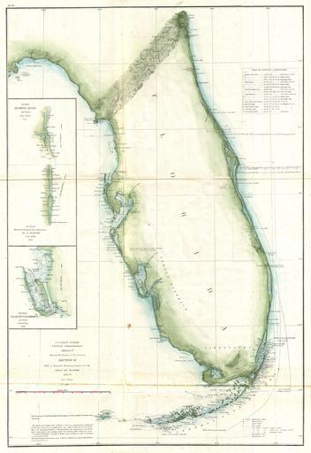 Keywords: 1859 U.S. Coast Survey Map of Florida - Geographicus - Florida-uscs-1859.jpg A beautiful example of the U S Coast Survey ™s 1859 triangulation chart or map of the Florida Peninsula This map covers from St Augustine and Apalachee Bay southwards as far as Key West and the Dry Tortugas Triangulation charts of this type were prepared by the Coast Survey before more detailed survey work could take place They firmly mapped the coastline noting various pointes inlets harbors and Islands Names Fort Lauderdale St Augustine Key West and Miami This particular example features two insets focusing on St John ™s River and Charlotte Harbor The upper right quadrant features a table of latitudes and longitudes identifying major points cities and lighthouses This chart is based upon an initial reconissaice completed by the Coast Survey's resident Gulf expert F H Gerdes Published in the 1859 Superintendent's Report under the supervision of A D Bache one of the most prolific and influential Superintendents of the U S Coast Survey 1859 dated Size in 23 17 object history credit line accession number Florida-uscs-1859 <i>Report of the Superintendent of the United States Coast Survey </i> Washington 1859 Geographicus-source PD-art United States Coast Survey maps Old maps of Florida 1859 maps |