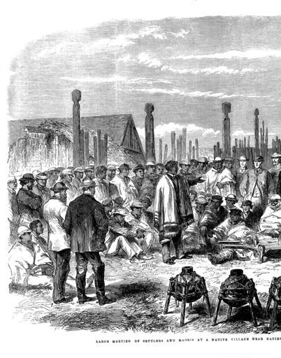 | Keywords: 1863 Meeting of Settlers and Maoris at Hawke's Bay, New Zealand - Left.png from Page 446 of the October 31 1863 The Illustrated London News MEETING OF SETTLERS AND MAORIS AT HAWKE'S BAY NEW ZEALAND The Engraving on page 436 represents a large meeting of the European and Maori inhabitants of the province of Hawke's Bay New Zealand held at the Pah Whakairo a native village about ten miles from Napier on the 20th of July last It is taken from several views of the meeting photographed by Mr Charles H Robson Mr Grindle Government interpreter at Napier has obligingly furnished us with some particulars of the meeting and of the condition and general conduct of the Maoris in that settlement at this juncture full of interest Throughout the whole of the disturbances so frequent of late years in New Zealand he says that the natives of that part of the country have always maintained the strictest neutrality and evinced an earnest desire to cultivate the good will and friendship of the settlers Even in times of strife and bloodshed their conduct has ever been marked by an anxiety to respect the lives and property of their white neighbours This feeling was strongly exemplified in the years 1857-8 during the feud between the Hapuku and the Moananui two rival chiefs of the province At that period although the contending tribes were often hard-pushed for provisions the sheep and cattle of the settlers grazed quietly in the vicinity of the fortified villages and not a single one was ever known to be missing; and the settlers themselves were earnestly warned to avoid approaching too near the contending parties whilst engaged lest some one might be injured by a stray bullet This quarrel had its origin in disputes and jealousies arising from the sale by one of the chiefs in question of blocks of land to the Government which according to native custom implicated the Government also as the purchasing party Their conduct therefore towards the settlers on that occasion certainly evinced a remarkable degree of forbearance for men of untutored minds sic At a later date when the famous King movement was fast gaining ground and many tribes were pledged to is support these people although professedly in favour of the movement uniformly retained their resolution to preserve peaceful relations with their European neighbours And at the present crisis in New Zealand whilst the powerful and warlike tribes of the Waikatos with whom the King movement originated are at war with the Government and their emissaries continually traversing the country exciting and urging the tribes to revolt the people of Hawke's bay remain steady in their resolution to preserve peace in their own district and publicly declare that although morally supporting the confederation of the tribes for the maintenance of their nationality they will if necessary resist by force any attempt of other tribes to disturb the peace of the province The meeting represented in our Engraving was called for the purpose of celebrating the completion of a large flour mill erected by the natives of the district with the assistance of the Government at the Pawhakairo village The Europeans were invited to attend to afford each party an opportunity of expressing to the other their doubts and fears in the present aspect of affairs in the country A large company assembled amongst whom were many ladies and gentlemen from the town of Napier and Donald M'Lean Esq the Superintendent of the Province This gentleman was for many years at the head of the Native Department under the general Government of the colony and is a man of great experience in all matters affecting the natives Possessing the entire confidence of both races and a perfect knowledge of the Maori language and character no man could be better adapted to allay the feelings of distrust naturally awakened in the breasts of these bold and warlike people by the stirring events passing in other parts of the colony Many chiefs representatives of various tribes addressed the meeting and all expressed their unaltered determination to live in peace and amity with their white neighbours But they said the measures then being taken by the local Government gave them much uneasiness Why said they are stockades being erected and men being drilled There can be no necessity for these preparations here We have always been your friends and have never given you cause to be suspicious of us nor have we ever mistrusted you; but now we are in doubt as to the meaning of these proceedings They were answered by his Honour the Superintendent who informed them that the militia were called out pursuant to instructions from the Governor; that this was usual amongst Englishmen in every country even in times of peace; that it had already been done in every other province in the island; that warning letters were continually being received from loyal natives in other districts of meditated attacks upon the town of Napier by the Waikatos now in arms against the Government together with other disaffected tribes; and that the stockades therefore and all the other preparations had no reference whatsoever to them but were merely precautionary measures to guard against threatened incursions of hostile tribes His Honour spoke at some length and the result was that the natives were fully satisfied and a paper was drawn up by them and signed by all the principal chiefs declaring their fixed determination to maintain peace in the province and to assist the Pakehas in repelling any hostile tribes This together with the speeches of the chiefs was afterwards published in a local newspaper printed in the Maori language called the Waka Maori o Ahuriri or the Maori Canoe of Ahuriri The gentleman near the centre of the engraving with his head uncovered is Mr M'Lean the Superintendent of the province At his feet is an aged chief named Porokuru seated in a wheelbarrow in which he had been conveyed to the spot being unable either to walk or stand erect fr
