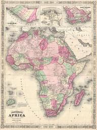 | Keywords: 1864 Johnson Map of Africa - Geographicus - Africa-johnson-1864.jpg A beautiful first edition example of A J Johnson ™s highly decorative 1864 map of Africa The map covers the entire African continent as well as adjacent parts of Arabia and the Mediterranean Throughout Johnson identifies various cities towns rivers and assortment of additional topographical details Johnson introduced this map in 1864 to replace the more primitive Colton mapping of Africa used in his earlier atlases This map accommodates recent discoveries and explorations in Africa It is consequently the first of Johnson ™s Africa series to accurately represent Lake Victoria and Mt Kilimanjaro Features the fretwork style border common to Johnson ™s atlas work from 1864 to 1869 Published by A J Johnson and Ward as plates 99-100 in the 1864 edition of Johnson ™s New Illustrated Family Atlas This is the first edition of the Johnson ™s Atlas to bear the Johnson Ward imprint and the only edition to identify the firm as the Successors to Johnson and Browning Successors to J H Colton and Company Dated and copyrighted Entered according to Act of Congress in the Year 1864 by A J Johnson in the Clerks Office of the District Court of the United States for the Southern District of New York 1864 dated 1864 Size in 17 5 23 5 object history credit line accession number s Geographical Statistical and Historic including The Latest Federal Census A Geographical Index and a Chronological History of the Civil War in America</i> first Johnson and Ward 1864 Geographicus-source PD-old-100 Maps by Alvin Jewett Johnson 1864 maps Old maps of Africa |