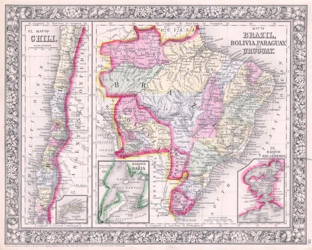 | Keywords: 1864 Mitchell Map of Brazil, Bolivia and Chili - Geographicus - SouthAmericaSouth-mitchell-1864.jpg A beautiful example of S A Mitchell Jr ™s 1864 two map sheet depicting parts of South America The left hand map depicts Chili with an inset of the Island of Juan Fernandez The right hand maps shows Brazil Bolivia Paraguay and Uruguay with insets of the Harbor of Bahia and the Harbor of Rio de Janeiro One of the most attractive American atlas maps of this region to appear in the mid 19th century Features the floral border typical of Mitchell maps from the 1860-65 period Prepared by S A Mitchell for inclusion as plate no 58 in the 1864 issue of Mitchell ™s New General Atlas Dated and copyrighted Entered according to Act of Congress in the Year 1860 by S Augustus Mitchell in the Clerk ™s Office of the District Court of the U S for the Eastern District of Pennsylvania 1860 dated Size in 13 5 11 object history credit line accession number SouthAmericaSouth-mitchell-1864 <i>Mitchell's New General Atlas containing Maps of the Various Countries of the World Plans of Cities Etc Embraced in Fifty-three Quarto Maps forming a series of Eighty-Four Map and Plans together with Valuable Statistical Tables </i> 1864 Edition Geographicus-source PD-old-100 Maps by Samuel Augustus Mitchell 1864 maps Brazil in the 1860s Old maps of Brazil Old maps of Bolivia Old maps of Chile Old maps of Paraguay Old maps of Uruguay Maps of Empire of Brazil |