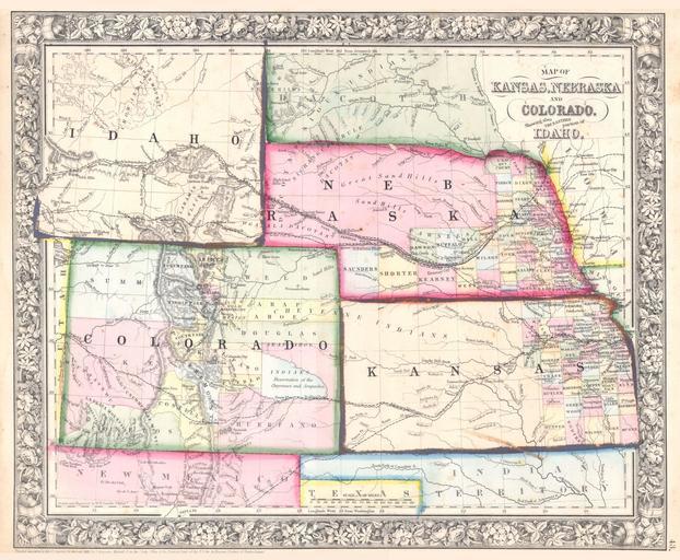 Keywords: 1864 Mitchell Map of Colorado, Kansas ^ Nebraska - Geographicus - COKANE-mitchell-1864.jpg A beautiful example of S A Mitchell Jr ™s 1864 map of Kansas Nebraska Colorado and Idaho Wyoming has yet to appear Counties cover only the eastern portions of Nebraska and the eastern third of Kansas Shows various proposed railroads geographic features American Indian tribes and gold deposits as well as providing details on towns counties and other political data Following the gold rush settlers teamed into the region seeking a new life and new opportunities in the American wild west Identifies both the Santa Fe Trail and the Pony Express Route One of the most interesting and ephemeral maps of this transitional region to appear in the mid 19th century Prepared by W H Gamble for inclusion as plate 43 in the 1864 issue of Mitchell ™s New General Atlas Dated and copyrighted Entered according to Act of Congress in the Year 1861 by S Augustus Mitchell Jr in the Clerk ™s Office of the District Court of the U S for the Eastern District of Pennsylvania 1861 dated Size in 14 11 5 object history credit line accession number COKANE-mitchell-1864 <i>Mitchell's New General Atlas containing Maps of the Various Countries of the World Plans of Cities Etc Embraced in Fifty-three Quarto Maps forming a series of Eighty-Four Map and Plans together with Valuable Statistical Tables </i> 1864 Edition Geographicus-source PD-old-100 Maps by Samuel Augustus Mitchell Old maps of Colorado Old maps of Kansas Old maps of Nebraska 1864 maps |
