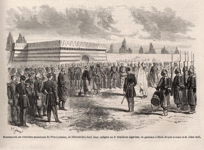 Keywords: 18650408 - Le Monde illustré - Enterremment au Père-Lachaise.jpg Enterrement au cimetière musulman du Père-Lachaise de Séliman-ben-Saïd lieut indigène au 2e tirailleurs algériens en garnison à Paris cite journal Maxime Vauvert Enterrement de Seliman-ben-Saïd Le Monde illustré 1865-04-08 221 16 417 http //gallica bnf fr/ark /12148/bpt6k6224535d/f12 author 1865-04-08 other fields PD-old Gustave Janet Gédéon Baril Grave of Séliman-ben-Saïd Le Monde Illustré Engravings of the Père-Lachaise Cemetery Père-Lachaise Cemetery in the 19th century 1865 in art |