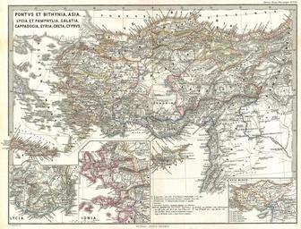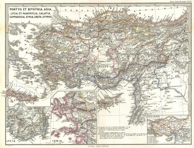Keywords: 1865 Spruner Map of Asia Minor (Turkey) in Antiquity - Geographicus - AsiaMinor-spruner-1865.jpg A particularly interesting map this is Karl von Spruner ™s 1865 rendering of Asia Minor in antiquity This map covers Asia Minor from the Aegean Sea to Armenia and from Cyprus to the Black Sea including all of modern day Turkey Cyprus Lebanon and Syria Like most of Spruner ™s work this example overlays ancient political geographies on relatively contemporary physical geographies thus identifying the sites of forgotten towns and villages the movements of armies and the disposition of lands in the region There are three insets in the lower quadrants focusing on the early kingdoms of Lycia and Ionia as well as a general overview of Asia Minor As a whole the map labels important cities rivers mountain ranges and other minor topographical detail Territories and countries outlined in color All text is in Latin The whole is rendered in finely engraved detail exhibiting the fine craftsmanship for which the Perthes firm is known Of particular interest to classical scholars 1865 undated Size in 16 13 object history credit line accession number AsiaMinor-spruner-1865 Spruner Karl von <i>Spruner-Menke Atlas Antiquus </i> Gotha Justus Perthes 1865 Geographicus-source PD-old-100 Karl Spruner von Merz Old maps of Turkey 1865 maps |