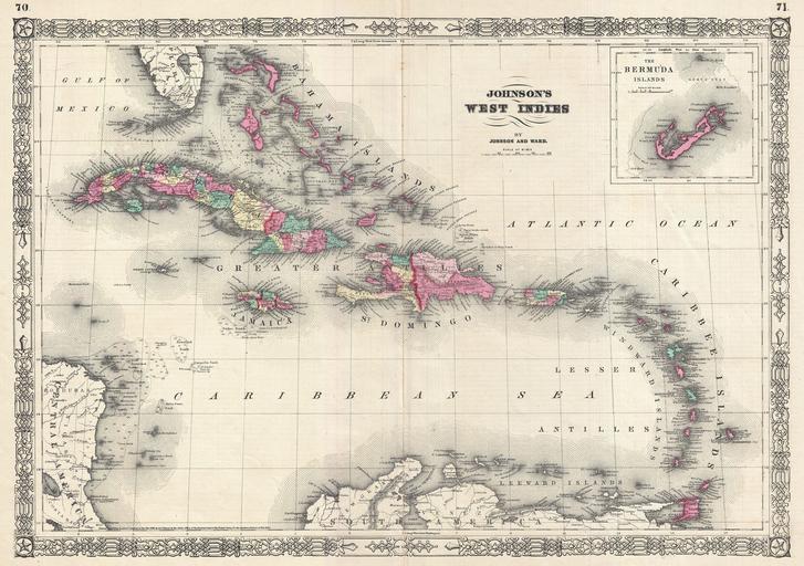 Keywords: 1866 Johnson Map of the West Indies and Caribbean - Geographicus - WestIndies-johnson-1866.jpg A beautiful example of A J Johnson ™s 1866 map of the West Indies Covers from Florida to Venezuela and from Honduras to Barbados Includes the Bahamas Cuba Jamaica Santo Domingo Hispaniola Porto Rico and the Lesser Antilles or Windward Isles An inset of Bermuda appears in the upper right quadrant Features some offshore detail with depth soundings in the Pedro Bank off Jamaica off the coast of Nicaragua and in the Bahama Bank Larger islands feature color coding according to district Throughout Johnson identifies various cities towns rivers and assortment of additional topographical details Features the fretwork style border common to Johnson ™s atlas work from 1864 to 1869 Published by A J Johnson and Ward as plate numbers 70 and 71 in the 1866 edition of Johnson ™s New Illustrated Family Atlas 1866 dated 1864 Size in 23 5 17 5 object history credit line accession number s Geographical Statistical and Historic including The Latest Federal Census A Geographical Index and a Chronological History of the Civil War in America</i> 1866 Geographicus-source PD-old-100 Maps by Alvin Jewett Johnson 1866 maps Old maps of the Caribbean Caribbean in the 1860s |