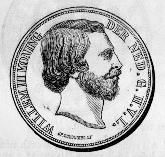 | Keywords: 1869 Dutch 2.5 guilders obverse.png A Dutch silver 2 ½ guilder piece of 1869 with the head of William III Weight 804 fineness 944 Value 4s 3d Obverse shown Engraving from the article Recent Coinage of the World in the Companion to the British Almanac of 1874 1874 Name of coin designer or engraver not known PD-old 1869 coins Coins of the Netherlands 1869 William III of the Netherlands on coins Gulden 1869 Coins with a face value of 2 5 | ||||