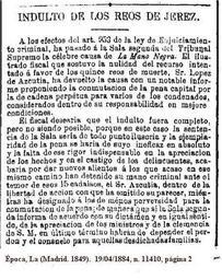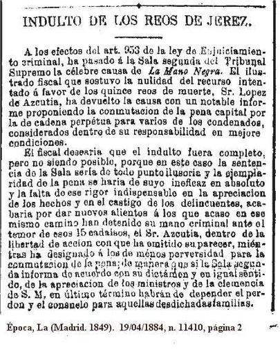 Keywords: 1884-Manuel-Azcutia-mano-negra-indulto.jpg it Indultos de los reos de Jerez - La Epoca Madrid 19 4 1884 pagina 2 own Albertomos 1884-04-19 INDULTOS DE LOS REOS DE JEREZ A los efectos del articulo 953 de la ley de Enjuiciamiento criminal ha pasado a la Sala segunda del Tribunal Supremo la celebre causa de La Mano Negra El ilustrado fiscal que sostuvo la nulidad del recurso intentado a favor de los quince reos de muerte Sr Lopez de Azcutia ha devuelto la causa con un notable informe proponiendo la conmutacion de la pena capital por la cadena perpetua para varios de los condenados considerados dentro de su responsabilidad en mejore condiciones El fiscal desearia que el indulto fuera completo pero no siendo posible porque en esto caso la sentencia de la Sala seria de todo punto ilusoria y la ejemplaridad de la pena se haria de suyo ineficaz en absoluto y la falta de ese rigor indispensable en la apreciacion de los hechos y en el castigo de los delincuentes acabaria por dar nuevos alientos a los que a caso en ese mismo camino han detenido su mano criminal ante el temor de esos 15 cadaisos el Sr Azcutia dentro de la libertad de accion con que ha emitido su parecer mientras ha designado a los de menos perversidad para la conmutacion de la pena de manera que si la Sala segunda informa de acuerdo con su dictamen y en igual sentido de la apreciacion de los ministros y de la clemencia de S M en ultimo termino habran da depender el perdon y el consuelo para aquellas desdichadas famialias PD-old ImageNote 1 13 22 427 488 455 575 2 INDULTOS DE LOS REOS DE JEREZ A los efectos del articulo 953 de la ley de Enjuiciamiento criminal ha pasado a la Sala segunda del Tribunal Supremo la celebre causa de La Mano Negra El ilustrado fiscal que sostuvo la nulidad del recurso intentado a favor de los quince reos de muerte Sr Lopez de Azcutia ha devuelto la causa con un notable informe proponiendo la conmutacion de la pena capital por la cadena perpetua para varios de los condenados considerados dentro de su responsabilidad en mejore condiciones El fiscal desearia que el indulto fuera completo pero no siendo posible porque en esto caso la sentencia de la Sala seria de todo punto ilusoria y la ejemplaridad de la pena se haria de suyo ineficaz en absoluto y la falta de ese rigor indispensable en la apreciacion de los hechos y en el castigo de los delincuentes acabaria por dar nuevos alientos a los que a caso en ese mismo camino han detenido su mano criminal ante el temor de esos 15 cadaisos el Sr Azcutia dentro de la libertad de accion con que ha emitido su parecer mientras ha designado a los de menos perversidad para la conmutacion de la pena de manera que si la Sala segunda informa de acuerdo con su dictamen y en igual sentido de la apreciacion de los ministros y de la clemencia de S M en ultimo termino habran da depender el perdon y el consuelo para aquellas desdichadas famialias ImageNoteEnd 1 La Mano Negra 1884 in Spain Manuel Lopez de Azcutia La Epoca Madrid |