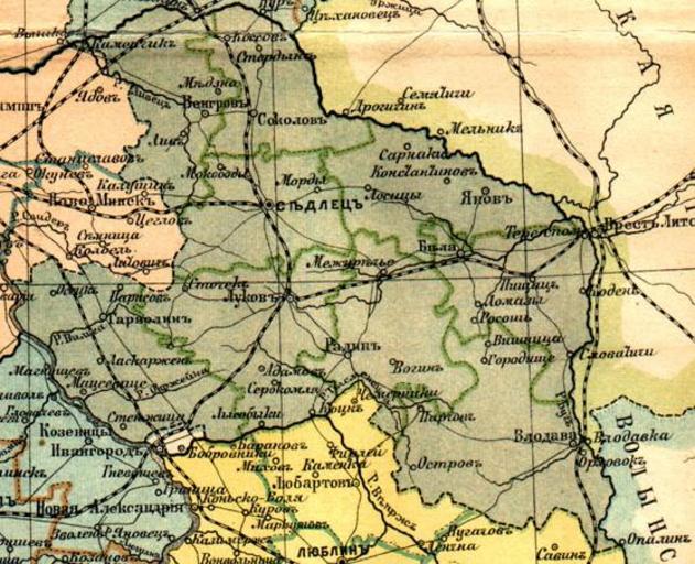 Keywords: Седлецкая губерния 1896.jpg Седлецкая губе ния в 1896 году Genealogia Ru 2008-11-16 Yury Maydan PD-Old Old maps of Congress Poland Powiat siedlecki Z Maps of Sedletz Governorate