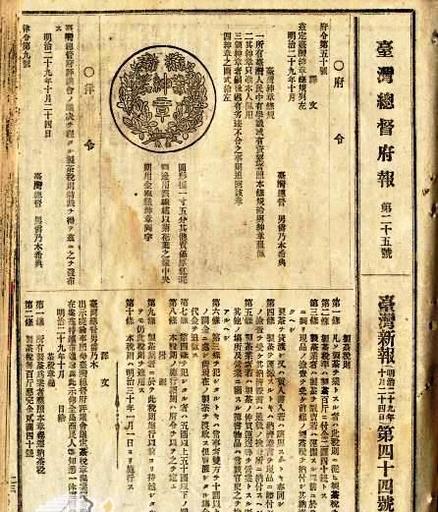 | View Original: | 1896_October_Gazette_of_the_Governor-General_of_Taiwan_明治29年10月臺灣總督府報-臺灣紳章條規.jpg (446x521) | |||