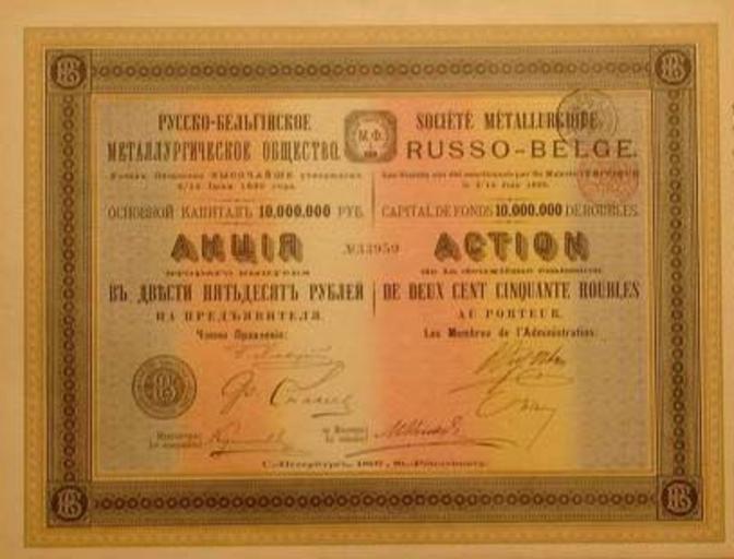 | Keywords: 1897. Акция РБМО.jpg Акция Русско-Бельгийского металлу гического общества http //enr dn ua/ p 3500 1897 Русско-Бельгийское металлу гическое общество PD-RusEmpire Stock certificates of Russian-Belgian metallurgical society Files uploaded by Andrew Butko from various sources 19th century |