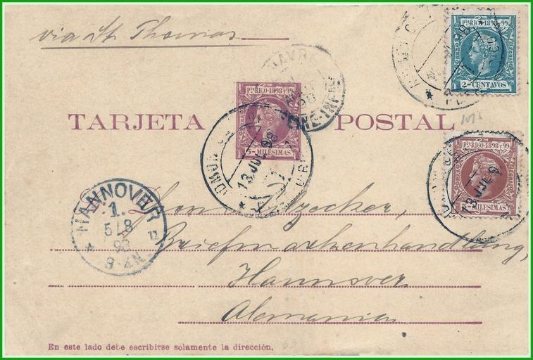 | Keywords: 1898-Puerto Rico-5m-PostalCard-UsedGermany.jpg en 1898 5 milesimas postal card uprated with 2 1/2 centavos adhesive stamps to Germany Spanish government for colony of Puerto Rico 1898 Spanish government for colony of Puerto Rico 1898 1898 PD-old Postal stationery of Puerto Rico |
