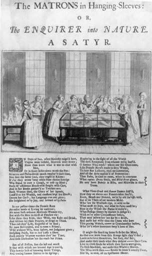 | Keywords: 18th-century-anti-sex-education.jpg The Matrons in Hanging-Sleeves or The Enquirer into Nature an eighteenth-century satire or satyr against sex-education This caricature print shows women and girls looking at an exhibition display of a wax-model cutaway view of human pregnancy with other suggestive statuettes on a side table at left ; the poem beneath condemns the bawdy Itch of knowing secret Things / And tracing human Nature to its Springs as being a symptom of modern degeneracy as opposed to the female virtue of previous ages -- and as being morally dubious for inherently frail women and incompatible with the highly-desirable innocence of unmarried girls The poem in the print reads In days of Yore when modesty reign'd here Virgins were bashful Matrons were severe; None knew then what it was to chat with Men Or in smart Billets-doux to use the pen Sermons and Psalm-Books much employ'd their time Nor save the latter read they ought in Rhime If e'er they wrote 'twas when some choice Receipt i e recipe Was found to cure a Cough or toss up Meat; Such th' Assiduous House-wife sought with Care And in her Books preserv'd as Treasure rare Each Woman then the Glory of her Spouse Look'd to his Wealth and constant kept his House Decent her Garb; her Language true and plain; She heightened ev'ry Joy and softened ev'ry Pain In our politer times the Female Race An easier mode of Living by far embrace No more such arduous Methods Women try But with the Men in thirst of Pleasure vie Like them they Ride they Walk nay Rake and Drink And seldom say their Prayers or deign to Think Thus rub thro' Life forgetful of its End; By none Befriended and to none a Friend; Wild without Wit from Spleen -- not Judgment -- grave; Despising Faith but to her Lusts a Slave Each courtly Wanton wanders thro' her Time And feels Declension i e herself to be declining ere she reach her Prime But of all Follies sure the last and worst Is that with which our learned Age is curs'd This bawdy Itch of knowing secret Things And tracing human Nature to its Springs; Exploring in the sight of all the world The dark Receptacle from whence we're hurl'd O famous wax-work Where our fair ones come Like female Neros made to see a womb To hear fine Lectures read on Generation And all the Arts explain'd of Procreation That Rake in time to come when he convenes What copious Drury sends and Wild-street gleans He may have Bawds in Bibs and Midwives in their teens i e sex education would lead to child prostitution What Vices Greek and Roman Dames defil'd How they on Slaves and Fencers i e gladiators often smil'd Rode Drink and Danced we're by old Sat'rists told; But of no Thais of our modern Mold -- Who ere for Wedlock ripe is wild to see What must its Joys and what its Pains must be; How in the Womb the Foetus is reclin'd; What Passage thence by Nature is design'd; With ev'ry other Circumstance beside That may inform her ere she be a Bride And make her wiser than the Dame who bore This prying Wench -- or Grandmother before Who liv'd when Innocence sway'd here of Yore O might the shocking Scene so strike the Mind As that true Sense from this strange sight they'd find Learn to believe themselves but frail tho' fair; And make their Souls what they deserve -- their Care; Live to those Ends for which their Lives were given To bless Mankind and make this World a Heaven The Wax-work then -- should be deem'd worthy Fame Not be as now all its Spectators' Shame The Roman emperor Nero is mentioned above because of the story that when he assassinated his mother Agrippina he cut open her womb so that he could see where he had come from For an 18th-century wax model somewhat like the one which is considered to be a source of moral corruption here see Image Specola 20 jpg from en La Specola museum ---- Bibliographic information found on the LoC site TITLE The matrons in hanging-sleeves or The enquirer into nature - a satyr CALL NUMBER PC 2 - Matrons in hanging-sleeves A size P P REPRODUCTION NUMBER LC-USZ62-59610 b w film copy neg No known restrictions on publication SUMMARY Print shows women and children of all ages viewing exhibits at the Wax-works and see a Womb to hear fine Lectures read on Generation and all the Arts explain'd of Procreation ; in a large display case is a life-size figure of a pregnant woman with a cut-away view showing a fetus in the womb and on a table are figures in an erotic embrace MEDIUM 1 print etching CREATED/PUBLISHED 1802 NOTES Title from item Forms part of British Cartoon Collection Library of Congress SUBJECTS Women--Social life--England--London--1800-1810 Women--Education--England--London--1800-1810 Wax figures--1800-1810 Galleries museums--England--London--1800-1810 Human life cycle--1800-1810 FORMAT Satires Visual works British 1800-1810 Etchings British 1800-1810 REPOSITORY Library of Congress Prints and Photographs Division Washington D C 20540 USA DIGITAL ID b w film copy neg cph 3b07352 http //hdl loc gov/loc pnp/cph 3b07352 CARD 2003675443 Edited from image http //memory loc gov/master/pnp/cph/3b00000/3b07000/3b07300/3b07352u tif on Library of Congress website http //hdl loc gov/loc pnp/cph 3b07352 Based on women's clothing styles much more likely from ca 1770s than 1802 as suggested by Library of Congress author PD-old-100 18th-century fashion Pregnancy in art Gynaecology Sex education 18th-century caricatures Wax Housewives in art |