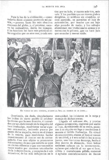 Keywords: “En virtud de esta condena, ataron al inca al tronco” per al conte de Arguedas, Alcídes: “La muerte de Inca”. Hojas selectas. Revista para todos. Barcelona, Año VI (04/1907), núm 64, p. 345, b/n.