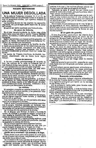 | Keywords: 1907-06-13-Epoca-suceso-misterioso.jpg es SUCESO MISTERIOSO UNA MUJER DEGOLLADA En la calle de los Tudescos numeros 13 15 y 17 se ha desarollado en las primeras horas de la tarde de hoy un sangriento suceso que aparece rodeado de gran misterio La inquilina de uno de los cuartos ha aparecido degollada sin que se sepa quien haya sido el autor del crimen El movil del delito suponese que fuera el robo Un poco de historia En el piso tercero izquierda de dicha casa vivia desde hace unos dos años y medio Vicenta Verdier soltera de treinta y cuatro años de edad natural de Zaragoza Segun las noticias que hemos podio adquirir un agente de Bolsa subvenia a las necesidades de Vicenta y la visitaba con frequencia Esta vida no era del agrado de la familia de ella y desde que se enteraron las relacciones que sostenia con dicho agente rompieron con ella todos sus parientes excepto una hermana con la que continuò tratandose y a la que iba a ver todas las tardes La madre de Vicenta vive fuera de Madrid habiendo abandonado ella su tierra hace algun tiempo Voces de socorro A la una y media proximamente de la tarde de hoy los vecinos de la calle de los Tudescos que viven frente a dicha casa oyeron la voz de mujer que demandaba ausilio con gran angustia Los gritos de socorro fueron cada vez mas debiles hasta que se perdieron por completo Dichos vecinos alarmados por aquello se presentaron en la Comisaria del distrito dicendo que acababan de oir pedir socorro a una mujer en el piso tercero de la casa numeros 13 15 y 17 El teniente Alastuy con dos guartdias y el alcalde del barrio Sr Perez Chozas que por alli pasaba subieron a dicho cuarto y en vista de que no obtenian contestacion a sus llamadas ordenaron a un cerrajero que franqueara la entrada La victima El cerrajero cumpliò su mision forzando la puerta que tenia el cerrojo corrido y las personas citadas entraron en el cuarto En el pasillo se veian grandes manchas de sangre que en reguero seguian hasta la sala y desde esta habitacion al gabinete Una vez dentro de este se viò que habia sido escenario de un sangriento suceso Todo el suelo y muchos muebles estaban manchados de sangre viendose ademas un hermoso macetero hecho pedazos y advertiendose por todas partes señales de que se habia sostenido lucha La victima de ella aparecia en la alcova En el angulo que forman la cama y la mesa de noche de rodillas y apoyada la cabeza contra el lecho estaba la inquilina del piso Vicenta Verdier sobre un inmenso charco de sangre Se acercaron a ella y vieron que era cadaver; pues tenia en el cuello una herida tan profunda que casi le separaba la cabeza del tronco En las manos tambien tenia algunas heridas Proxima al cadaver en el suelo se veia una pequeña imagen de plata de la Virgen del Pilar En las ropas de Vicenta se advertian señales de lucha; pues tenia el delantal y la blusa rotos Quien es el criminal “ La entrada y fuga Hasta ahora no se sabe nada acerca de quien pueda ser el autor del crimen creyendose que el movil del delito haya sido el robo En el armario de luna que hay en el gabinete fueron encontrados varios estuches de alhajas vacios Algunas personas creian que el criminal fuera algun otro amante que tuviese Vicenta; pero la portera de la casa y los vecinos afirman que no conocian como tal mà s que al agente de Bolsa Tampoco se sabe à punto fijo por donde pudo entrar el autor del crimen porque la portera manifestò que no viò subir a nadie En cambio la huida puede asegurarse que la verificò por una ventana que hay en un alcoba de la casa y que da à un tejado; siendo muy facil saltar de un lado a otro; muy bien por lo tanto pudo entrar por el mismo sitio En el tejado de que hablamos se ve una de las tejas separada de su sitio habiendo manifestado un albañil que hizo un reconocimiento que aquella teja hace ya tiempo que debe estar en la forma en que ha sido hallada El Juzgado de guardia El juez de guardia que lo era el del districo de la Universidad Sr Martinez Marin en union del ecribano Sr Moreno Pastor el oficial D Luis Rubio y el alguacil D Santiago Martinez se presentò desde los primeros momentos en el lugar del suceso empezando a instruir las primeras diligencias Tomò declaracion à la portera que como todas las de su clase en estos casos dijo que no sabia nada Tambien prestò declaracion la vecina del piso tercero derecha D ña Matilde Merello Esta señora manifestò que tenia alguna amistad con la victima à la cual hacia la comida todos los dias Hoy estuvo hablando con ella à eso de las doce y media à cuya hora se despidiò de Vicenta que le dijo - Hasta luego y que me tenga usted la comida en seguida Despues ignora lo que ocurriò; pues ella no supo nada hasta que oyò los golpes que daban para abrir la puerta El juez ordinò que se practicaran minuciosos registros en todos los tejados de las casas proximas para ver si daban algun resultado; pues hay personas que afirman haber visto a la hora en que ocurriò el suceso à un ombre por aquellos sitios Buscando antecedentes Hemos procurado indagar algunos antecedentes de la vida de Vicenta Verdier que vinò a vivir à Madrid logrando averiguar que habitò en la travesia de las Pozas num 1 Allì la portera no sabia nada; pues llevaba solamente dos meses en la casa Buscamos a su antecesora y esta no habia conocido a Vicenta manifestandonos que la portera por quien preguntamos habia muerto Por fin encontramos una vecina que recordaba que Vicenta habia vivido en aquella casa pagandole el cuarto; pero al enterarse del fin disastroso de Vicenta se encerrò en una negativa rotunda; pues creyò que eramos policias y podiamos perjudicarla it Il primo articolo di stampa che dà notizia del delitto compiuto nella centralissima via madrilena dei Tedeschi in cui rimase vittima Vicenta Verdier apparso su La Epoca di Madrid il giorno stesso del delitto ossia il 13 6 1907 Subito viene definito misterioso questo crimine per il modo in cui l'assassino fece perdere le sue tracce abbandonand