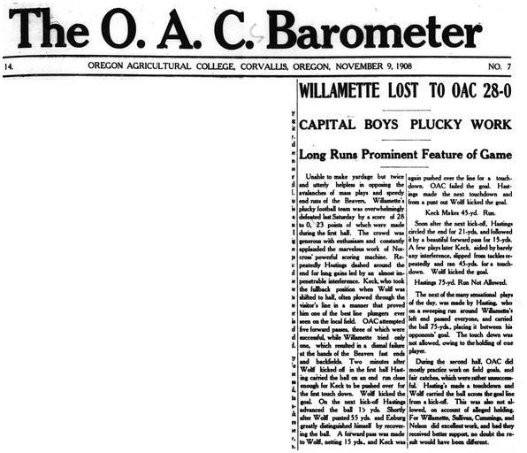 Keywords: 1908 Beavers Reference.jpg en This 1908 article from the O A C Barometer is the earliest known reference to the Oregon State Beavers The team usually was known as the Aggies until several years later Most sources incorrectly identify 1916 as the first known reference The O A C Barometer Oregon Agricultural College Oregon State University The O A C Barometer no author printed file created from microfilm 1908-11-08 PD-old This image was scanned from microfilm at the Oregon State University Library PD-old-100 1908 newspapers 1908 in Oregon |