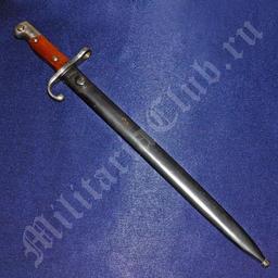 | Keywords: Клинок штыка однолезвийный, с долом с обеих сторон. Рукоять образована двумя деревянными щечками, скреплёнными с хвостовиком двумя заклёпками. Отверстие для чистки шомпола прямоугольное, расположено в щечках рукояти, рядом с крестовиной. В головке рукояти Т-образный паз и пружинная защёлка с внутренним расположением спиральной пружины. Крестовина с загнутым вперёд концом оканчивающимся шариком и кольцом для ствола со стороны обуха клинка. Ножны стальные с овальным шпеньком и шариком на конце.