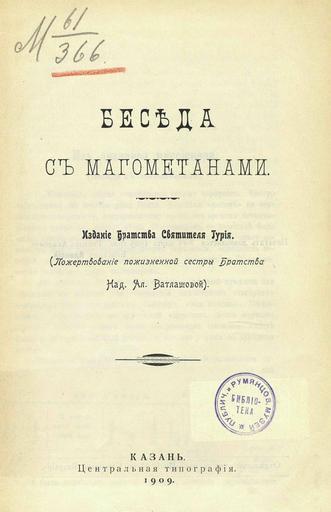 Беседа с магометанами / [Свящ. Сергий Багин]. - Казань : Братство святителя Гурия, 1909 (Центр. тип.). - 15 с.; 23.