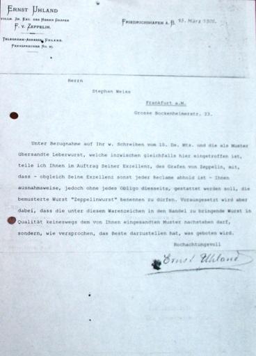 Keywords: 1909 Genehmigungsschreiben.jpg en Permission to use the name Zeppelin for the product Zeppelinwurst de Genehmigung das Produkt Zeppelinwurst nach dem Grafen von Zeppelin zu benennen Festplattenupload Ernst Uhland 1909 1909 PD-old Sausages of Germany |