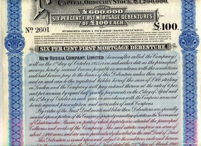 Keywords: 1910. Новороссийское общество NRC002.jpg en Share Certificate No 2601 for 100 UK Pounds Sterling - New Russia Company Limited - Printed Published by Waterlow Sons London England - 6th April 1910 - The Original Share Certificate No 2601 is owned by Dr David E Probert and is in the Probert Family Archives Edwin James Williams - Great Great Grandfather of Dr David E Probert was employed by the New Russia Company Limited in the town of Hughesovka since 1961 - Donetsk as its Chief Mining Geologist from the 1870s to around 1905 1910 originally printed by Waterlow Sons London UK photographed by Dr David E Probert http //www valentina net/NRC/ Ди екция ово оссийского общества Directors of the New Russia Company Limited - Signed by Director - Archibald Balfour July 1840 - October 1922 other versions Custom license marker 2014 11 07 PD-old Files uploaded by Andrew Butko from various sources 20th century Stock certificates of New Russia Coal Iron and Rail-making Company Historical non-photos images of Donetsk by alphabet 1910 in Donetsk Uploaded with UploadWizard |
