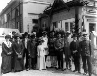 View Original:1912. 04. Группа членов императорского пожарного общества и гостей у показательной постройки Сельского огнестойкого строительства.jpg (1524x1200)