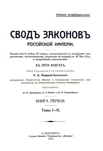 | Keywords: Свод законов (1912).jpg ru Свод законов Российской импе ии Полный текст всех 16 томов согласованный с последними п одолжениями постановлениями изданными в по ядке ст 87 Зак Осн и позднейшими узаконениями Книга пе вая 1912 http //rusantico ru/images/cms/data/mg_6462 jpg rusantico ru И Д о духай-Болтовский П Балканов С С Войт В Э Ге ценбе г other versions Custom license marker 2015 01 24 PD-Russia Law of the Russian Empire | ||||