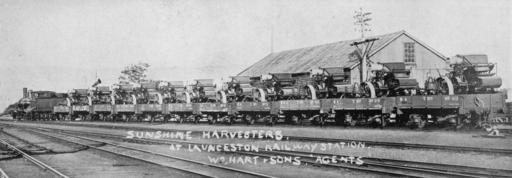 Keywords: tasmania blackandwhite monochrome outdoor black and white Load of Sunshine harvesters for William Hart & Sons at Launceston railway station, hauled by C class locomotive. Load of Sunshine harvesters for William Hart & Sons at Launceston railway station, hauled by C class locomotive. |