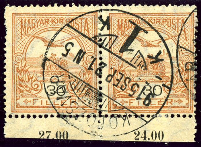 | Keywords: 1915 Kolozsvar 30filler paire Transylvania.jpg en Kingdom of Hungary stamps issue 1913 30 fillér pair orange-brown SG182 cancelled Kolozsvar 1 Transylvania Romania in 1915 Ungarn 30 f braunorange/schwarz Michel N°119 1915-09-12 scan 2013-03-13 10 39 01 own Jacquesverlaeken Scanned object 100 years old cancelled cc-zero 1913 stamps of Hungary Uploaded with UploadWizard Postmarks of Romania Cluj-Napoca | ||||