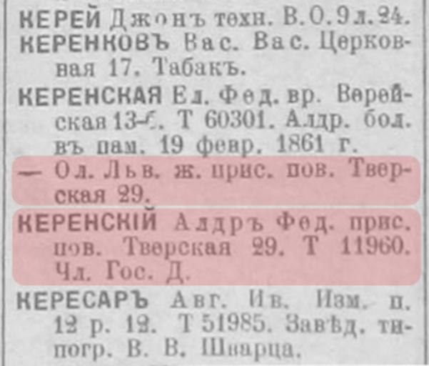 | Keywords: Супруги Керенские, 1917.jpg ru Суп уги Ке енские в сп авочнике Весь Пет ог ад 1917 2014-11-11 20 07 22 Весь Пет ог ад на 1917 год ад есная и сп авочная книга г Пет ог ада Пет ог ад Това ищество А С Суво ина « овое в емя» 1917 С 308 author other versions PD-old-70-1923 Uploaded with UploadWizard Alexander Kerensky |