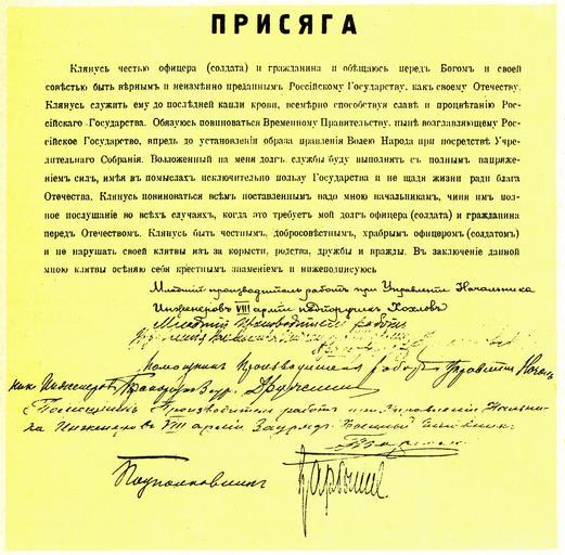 | Keywords: 1917 Переприсяга Д.Карбышева Врем.правительству Родина8-9 1993.jpg Пе еп исяга В еменному п авительству России военнослужащих инжене ного ко пуса Русской Импе ато ской а мии Уп авления начальника инжене ов VIII усской а мии Последней стоит подпись подполковника Дмит ия Ка бышева Весна 1917 года Свой скан исто ического жу нала Родина 8-9 от 1993 by Vizu Scanned from magazine Родина 8-9 от 1993 by Vizu Transferred from http //ru wikipedia org ru wikipedia by User Infovarius spring 1917 В еменное п авительство текст Д Ка бышев подпись PD-RusEmpire PD-ineligible Original upload log page ru wikipedia 1917_ D0 9F D0 B5 D1 80 D0 B5 D0 BF D1 80 D0 B8 D1 81 D1 8F D0 B3 D0 B0_ D0 94 D0 9A D0 B0 D1 80 D0 B1 D1 8B D1 88 D0 B5 D0 B2 D0 B0_ D0 92 D1 80 D0 B5 D0 BC D0 BF D1 80 D0 B0 D0 B2 D0 B8 D1 82 D0 B5 D0 BB D1 8C D1 81 D1 82 D0 B2 D1 83_ D0 A0 D0 BE D0 B4 D0 B8 D0 BD D0 B08-9_1993 jpg 2010-12-24 04 01 Vizu 2713×2666× 1590999 bytes <nowiki> Описание 1 Источник 1 В емя создания 1 Авто 1 </nowiki> 1917 in Russia Russia in World War I Dmitry Karbyshev Signatures of generals from Russia Russian Provisional Government |