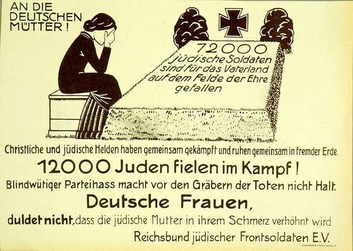 Keywords: 1920 poster 12000 Jewish soldiers KIA for the fatherland.jpg German 1920 poster/leaflet A Roll of Honor Commemorating the 12 000 German Jews Who Died for their Fatherland in World War I http //www germanjewishsoldiers com/leaflet php 1920 The Reich Association of Jewish Veterans PD old <br /> Text To German mothers 12 000 Jewish soldiers died on the field of honor for the fatherland <br> Christian and Jewish heroes fought together and rest together in foreign soil <br> 12 000 Jews fell in battle <br> Blind enraged Party hatred does not stop at the graves of the dead <br> German women <br> Do not allow that the suffering Jewish mother be mocked in her pain <br> The Reich Association of Jewish Combat Veterans <br> <br /> Texte Aux mères allemandes 12 000 soldats juifs sont tombés au champ d ™honneur pour la patrie Héros chrétiens et juifs ont combattu ensemble et reposent ensemble en terre étrangère 12 000 Juifs sont tombés au combat La haine partisane enragée ne s ™arrête pas devant les tombes des morts Femmes allemandes Ne tolérez pas que la mère juive soit bafouée dans sa douleur Alliance impériale des anciens combattants juifs PD-old World War I posters of Germany World War I forces of Germany Grief in art Jewish people of Germany Stab-in-the-back legend Jewish soldiers Jewish women in art |