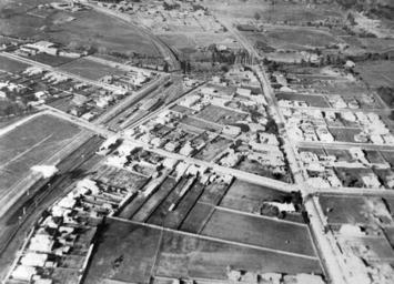 Keywords: tasmania blackandwhite monochrome aerial road outdoor building structure architecture building infrastructure black and white Aerial of Moonah looking south with the railway station to the left centre. H J King photo Aerial of Moonah looking south with the railway station to the left centre. H J King photo |