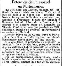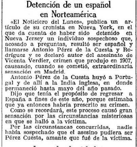 | Keywords: 1927-02-15-Vanguardia-detencion-de-un-español-en-Norteamerica.jpg it Articolo di stampa apparso su La Vanguardia del 15 2 1927 in cui si dà notizia dell'arresto in New Jersey di tale Antonio Perez de la Cuesta uno spagnolo che millanta di essere l'assassino di Vicenta Verdier al solo scopo di farsi rimpatriare gratis in patria dalle autorità 1927-02-15 La Vanguardia Barcelona 15 2 1927 pag 23 La Vanguardia DETENCION DE UN ESPAÑOL EN NORTAMERICA El Noticiero del Lunes publica un articolo de su cronista en Nueva York en el que da cuenta de haber sido detenido en New Jersey un individuo sospechoso que acosado a preguntas resultò ser español y llamarse Antonio Perez de la Cuesta y Rodriguez y se declarò autor del asesinato de Vicenta Verdier crimen que se produjo en 1907 causando cuando se cometiò extraordinaria sensacion en Madrid Antonio Perez de la Cuesta huyò a Portugal y de allì a la India inglesa en donde permaneciò hasta mayo del año pasado Dijo que tenia el proposito de regresar a España a fines de este año porque estimaba que ya entonces habria prescrito su crimen Como se recordarà este proceso causò gran sensacion por las circustancias misteriosas en que se hallò a la victima Por las circustancias concurridas nadie habia sospechado que el asesino pudiera ser Perez Cuesta amante que fuè de la victima DETENZIONE DI UNO SPAGNOLO IN NORDAMERICA Il Notiziario del Lunedì pubblica un articolo del suo cronista di New York in cui racconta che un individuo sospetto è stato arrestato in New Jersey che interrogato risultò essere spagnolo e chiamarsi Antonio Perez de la Cuesta e si dichiarò autore dell ™assassinio di Vicenta Verdier delitto commesso nel 1907 provocando a suo tempo straordinaria sensazione in Madrid Antonio Perez de la Cuesta fuggi in Portogallo e da lì andò nelle Indie inglesi dove soggiornò fino a maggio dell ™anno scorso Disse di aver il proposito di ritornare in Spagna alla fine di quest ™anno perché pensava che per allora sarebbe già prescritto il suo crimine Come si ricorderà questo fatto provocò grande sensazione per le circostanze misteriose in cui fu trovata la vittima Date le circostanze nessuno poteva sospettare che l ™assassino potesse essere Perez Cuesta che fu amante della vittima n d r che fu amante della vittima è una notizia priva di fondamento PD-old La Vanguardia news 1927 El crimen de la calle de los Tudescos Madrid 1927 in Spain Uploaded with UploadWizard |