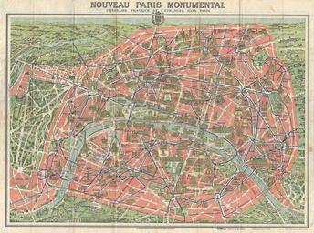 | Keywords: 1928 A. Leconte Map of Paris France w- Monuments - Geographicus - ParisMonumental-laconte-1928.jpg  This is an extremely attractive c 1928 tourist pocket map of Paris France Covers the old walled city of Paris and the immediate vicinity Important buildings are shown in profile including the Eiffel Tower the Arc de Triomphe Sacre-Coeur the Pantheon and others Shows both the train and Metro lines throughout the city This map was issued in various editions from roughly 1900 to 1937 Though most examples are undated we can assign an approximate date due to the development of the Metro system and the map's overall style and construction Attached to original red paper booklet which is itself split at spine A similar map of the greater Paris environs appears on the verso Engraved by L Poulmarie and printed by Gaston Maillet Published by A Leconte of 38 Rue St Croix de la Bretonnerie Paris 1928 undated Size in 27 21 object history credit line accession number ParisMonumental-laconte-1928 Leconte A <i>Plan Monumental Paris Environs Itineraire Metropolitan</i> 1928 Geographicus-source PD-art Maps of Paris in the 20th century 20th-century maps of Paris Maps of landmarks in Paris 1928 maps 1928 in Paris |
