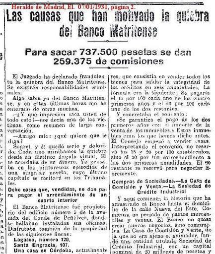 | Keywords: 1931-Banco-Matritense-quiebra-a 01.jpg it Le Cause che hanno provocato il fallimento del Banco Matritense 1931-01-07 El Heraldo de Madrid 7 1 1931 pag 2 El Heraldo other versions El Heraldo de Madrid 7 1 1931 pag 2 Las causas que han motivado la quiebra del Banco Matritense Para sacar 737 500 pesetas se dan 259 375 de comisiones El Juzgado ha declarado la quiebra del Banco Matritense Se exigiran responsabilidades criminales Algo sabia yo del Bano Matritense y en estas ultimas horas me he enterado de otras muchas - Y que impresion saca usted de todo esto “ nos decia una de las victimas como resumen de larga conversacion- - Amigo mio que quiera que le diga Sonrei y el quedo serio y dolorido Cadauno mirabamos la quiebra desde un distinto angulo visual El se acordaba de su dinero Yo pensaba en los pintorescos episodios de una singular novela cuyo ultimo capitulo se recitarĂ en los Tribunales Ocho casa que vendidas no dan para pagar el arrendamiento de un quarto interior El Banco Matritense fue proprietario del edificio numero 5 de la avenida del Conde de Penalver nd r actual Gran Via 22 donde se hallaban instaladas sus oficinas Disfrutaba tambien de la propriedad de las siguentes fincas - Lagasca numero 126 - Santa Engracia 107 - Una casa en Cordoba actualmente de la sucursal del Banco Espanol de Credito - Otra asa en Alcazar de San Juan - Otra en Jaen - Otra en Lucena - Dos en el Puerto de Santa Maria Esto fue el ano 1923 En la actualidad las oficinas estan instaladas en un oscuro cuarto interior de la casa numero 6 de la calle Nueva del Este en el extrarradio que tiene senalado ocho duros mensuales de arrendamiento y cuyos recibos hace tiempo que no se pagan Con el Banco Matritense se albergan la Sociedad de Credito Industrial y La Agricola Industrial de Mostoles sus filiales De todo el negocio queda la realidad de un cuarto oscuro unos libros de actas y un monton de documentos Alarma entre cuentocorrentistas “ Sispension de pagos “ Un convenio con los acreedores A fines del ano 1922 y principios del 23 cierta revista financiera hacia camapana sobre la situacion economica del Banco Matritense Presentaros los cuentacorrentistas a retirar fondos y el Baco tuvo que declararse en suspension de pagos Entonces funcionaba en Madrid una Sociedad dedicada a la compra y venta de antiguedades instalada en la calle de Jardines en cuyo negocio tenia partecipacion el director de la revista Esta Sociedad de compraventa se titulaba Casa de Comision y Venta Se nombraron interventores judiciales y a los interventores sucedio un Consejo a base de los directores de las sucursales de provincia que duro unos cuatro meses El Cosejo fue sustituido por otro Fueronse renovanndo los consejeros por sucesivas dimisiones El Banco habia llegado a pactar un convenio con sus acreedores que consistia en vender todos los bienes para saldar la integridad de los creditos en seis anualidades La formula era la siguente se pagaria el 15 por 100 cada uno de los cuatro primeros anos y el 20 por 100 cada uno de los dos restantes Y concretaba el convenio se garantia el pago de los dos primeros anos con el importe de la venta de los immuebles Esos immuebles eran los que hemos dicho antes El Consejo empezò a vender casas Interpretando el convenio no reservo los 15 y 20 por 100 establecidos sino el 30 por 100 correspondientes a las dos primeras anualidade El 60 restante se reservo para negociar libremente Compras de Sociedades “ La Casa de Comision y Venta “ La Sociedad de Credito Industrial Y aqui comienza la historia que ha arrastrado al Banco hasta el domicilio de la calle Nueva del Este Comienza un periodo de pactos mercantiles y ventas El Banco no quiso crear nuovos negocios sino comprarles La Casa de Comision y Venta de la que no era ajeno el animador fundo una entitad titulada Sociedad de Credito Industrial con un capital nominal de 20 millones de pesetas y un desembolso efectivo de 5 000 pesetas El Banco Matritense hizo entonces un contrato con la Casa de Comision y Venta para adquirir la nueva Sociedad La Casa de Comision y Venta estaba dirigida en aquel momento por un primo del director del Matritense El contrato fue el siguente El Banco compro a Casa de Comision y Venta unas 4 000 acciones una de 500 y otras de 250 pesetas nominales por valor total de 1 490 000 pesetas A cambio de que se vendio la Socied Credito Industrial al Banco Pues a cambio de 30 000 acciones que el Banco Matritense dio a la Sociedad Credito Industrial El Banco Matritense se comprometio a pagar los dividendos pasivos que se acordaran a la nueva Sociedad El Credito Industrial iba a dedicarse a la fabricacion de calzado y muebles de madera curvada En resumen 30 000 acciones de Matritense equivalentes a 1 500 000 pesetas nominales cambiaronse por 3960 acciones igual a 1 400 000 pesetas de Credito Industrial Se comenzaron a vender bienes y a la Sociedad Credito Industrial fue acudiendo el dinero que como producto de la venta de fincas obtenia el Banco La Fundacion Mercantil “ La Agricola Comercial de Mostoles Poco despues se fundo otra Sociedad Fundacion Mercantil que luego cambio el nombre por el de Fundacion Mercantil Corporativa Urbana El Banco compro la idea a una persona de Alicante La finalidad social era distribuir coupones en los comercios y construir casas para sortearlas entre los tenedores de tales coupons Y por ulltimo se fundo la Sociedad Agricola Comercial de Mostoles La s relaciones entre el Banco y todas estas filiales fueron agotando el dinero El Matritense tenia un modo original de abrir algunas cuetas corrientes En vez de dpositarse el dinero en el Banco era este quien daba el dinero al cuentacorrentista a cuenta de letras aceptadas Durante los anos 1924 y 1925 se vendieron las casas de Madrid y provincias En enero de 1926 el hasta entonces presidente del Consejo presento la dimision y se quedo en el puesto de presidente de Sociedad Credito Indystrial Habia desempenado antes las dos presidencias Las comisiones de