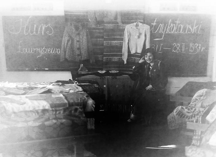 Keywords: Лаўрышава, 1937 г. Laŭryšava, 1937.jpg be Т ыкатажныя ку сы вёскі Лаў ышава за аз Шчо саўскага сельсавета аваг удскі -н Г одзенская вобл 1937 г Дзяўчына п адстаўляе вы абы ў мястэчку Любча цяпе аваг удскі -н en Knitted courses village Laŭryšava now Ščorsy village council Navahrudak district Hrodna region Belarus 1937 Girl shows the product in Liubča town now Navahrudak district pl Kurs trykotarski Ławryszewo 1937 r dziewczyna prezentuje wyroby kursantek w miasteczku Lubczy teraz rejon nowogródzki obwód grodzieński Białoruś 2016-04-14 02 31 18 http //belsat eu/pl/news/tylko-u-nas-unikalne-zdjecia-kresowego-miasteczka-lubcza-z-konca-lat-30-i-czasow-niemieckiej-okupacji-foto/ евядомы Unknown other versions 53 751944 26 057222 Custom license marker 2016 08 25 PD-old Populated places in Navahrudak District History of Hrodna Region Knitting