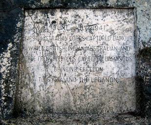 | Keywords: 1941 Prise de Damour.JPG fr Plaque commémorative de la prise de Damour en 1941 par les troupes australiennes own Photo personnelle Philippe Berthelot 2007-11-22 Plaques in Lebanon War memorials in Lebanon Plaques referencing 1941 Syria-Lebanon Campaign 1941 |