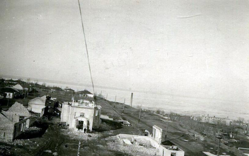 Keywords: 1943 Taganrog Petr I Troitsk okkup.jpg Вид на уины Т оицкой це кови с маяка Таган ог ап ель 1943 В отдалении виден памятник Пет у I А хив Анны Астаховой 1943-04 author PD-old 1943 in Taganrog