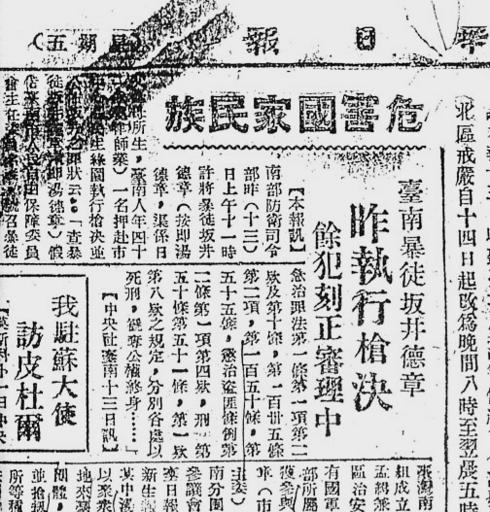 Keywords: 1947年3月13日臺灣臺南市長候選人湯德章律師遭蔣中正與陳儀所屬非法殺害 Lawyer and People-elected Mayoral-candidate of Tainan murdered by Chinese military.jpeg zh-tw 1947年3 14日中華日報 於原姓 井的湯德章遭軍方 臺南市民生綠 公開槍決的消息 2006-03-13 01 04 37 http //jalo pixnet net/blog/post/4096708-二二八 台灣 述乙篇---悼念湯德章就義59年 中華日報 Newspaper of TAIWAN According to the http //law moj gov tw/Eng/LawClass/LawAll aspx PCode J0070017 Copyright Act of the Republic of China Taiwan Article 32 Economic rights in a pseudonymous work or an anonymous work endure for fifty years from the time of public release; provided the economic rights shall be extinguished where it can be proven that the author has been deceased for over fifty years The provisions of the preceding paragraph shall not apply when the pseudonym of the author is well known to the public Article 33 Economic rights in works authored by a juristic person endure for fifty years after the public release of the work; provided if the work is not publicly released within fifty years from the completion of the creation the economic rights shall subsist for fifty years after completion of the creation 中華民 著 權法 : 第三十二 別著著 或不具名著 之著 財產權存續 間 別名著 或不具名著 之著 財產權,存續至著 公開發表後五十年 但可證明其著 人死亡已 五十年 ,其著 財產權消滅 前項規定,於著 人之別名為 周知 ,不適用之 第三十三 法人為著 人之著 財產權存續 間 法人為著 人之著 ,其著 財產權存續至其著 公開發表後五十年 但著 創 完成時起算五十年內 公開發表 ,其著 財產權存續至創 完成時起五十年 PD-Taiwan 1947 History of Tainan Thng Tek-chiong China Daily News 228 Incident of Taiwan 1947 |